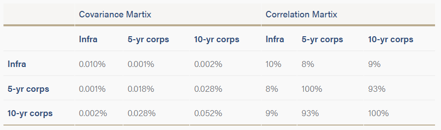 It is notable how low the return correlation is between infrastructure loans and corporate bonds, at less than 10%, as well as how low the corresponding covariances are. These correlations are in line with the study of private unlisted infrastructure funds in the Australian market discussed above.