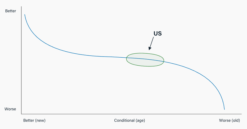 Infrastructure is considered to be highly elastic between the extremes of condition (Exhibit 6). It is similar in concept to the price elasticity of demand (Ped), where Ped is > 1.0, except here it is the performance elasticity of condition (Pec), where Pec is > 1.0 and changes in condition (the independent variable) lead to changes in performance (the dependant variable). This high elasticity helps to explain the relatively good US quality scores. In this context condition can be thought of as age and performance as perceived quality.