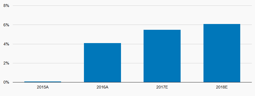 As shown in Exhibit 1, US public construction spending, a proxy for infrastructure reinvestment rates, reached a 20-year low of 21% of total tax receipts in 2016.(1) This is expected to change in the next two years. Goldman Sachs’ most recent analysis of the Department of Transportation (DOT) budgets for the 50 US states points to higher public construction spending for the first time since the financial crisis (see Exhibit 2). It is being driven by 24 states that passed legislation in 2016 and 2017, adding new funding sources for transport infrastructure investment. Goldman Sachs expects growth of 5.5% and 6.1% in 2017 and 2018 (11.6% collectively), up from 0.1% and 4.1% for 2015 and 2016 (4.2% collectively). This represents a 175% increase for 2017 and 2018 vs. 2015 and 2016.