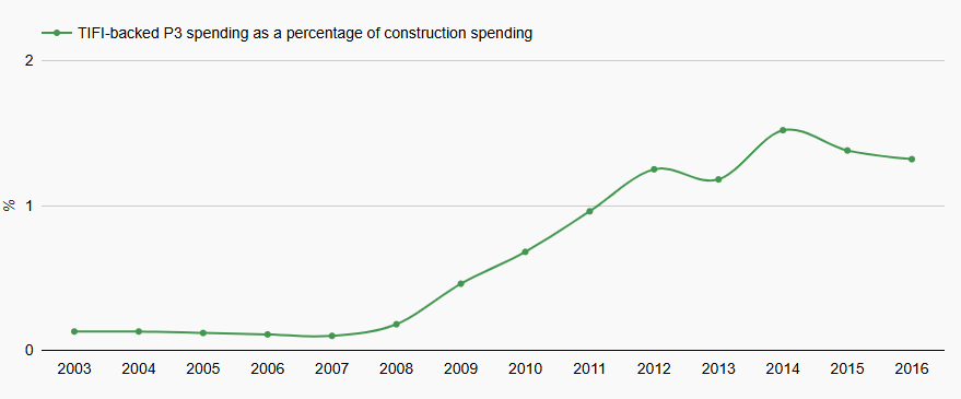 The Transportation Infrastructure Finance and Innovation Act (TIFIA) offers letter of credit to surface infrastructure projects. TIFIA has an enviable track record. It is estimated that the federal government will get back 99.9% of its money from the $21.8 billion of current letters of credit it has issued, and P3s have been the main recipient of TIFIA financing. There are suggestions to expand TIFIA given its strong performance and to consolidate it into similar federal programs for the water and railroad sectors (WIFIA and RRIF, respectively). Transportation P3s would benefit from TIFIA expansion.